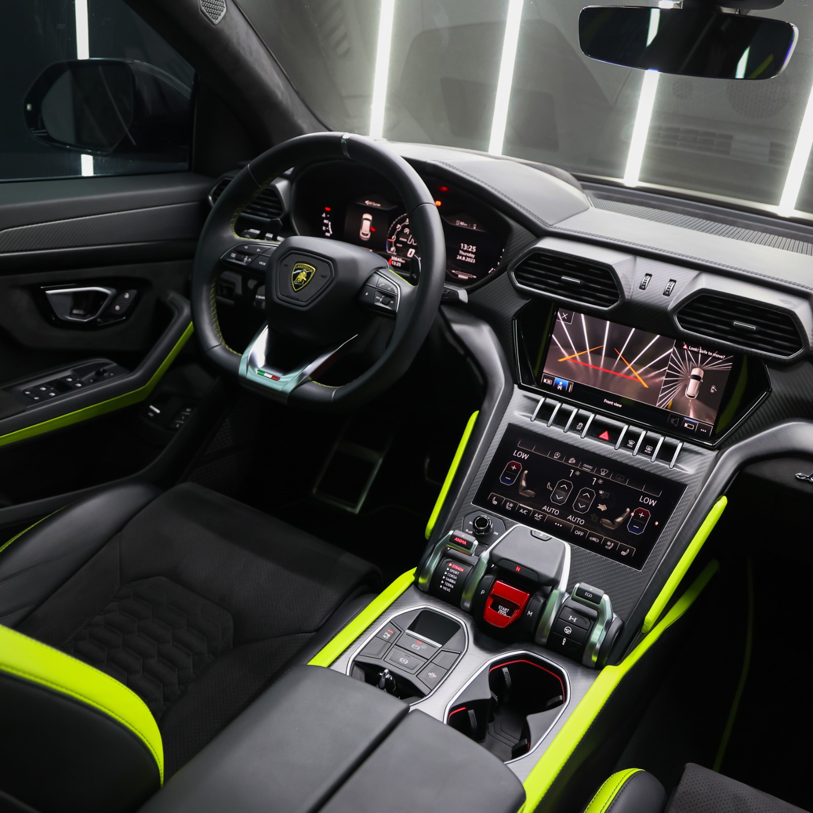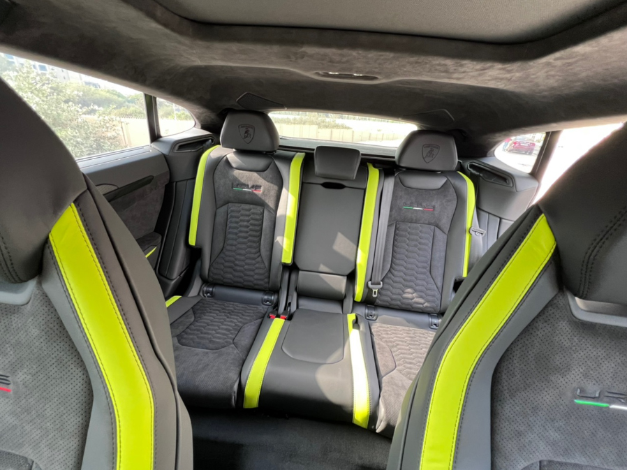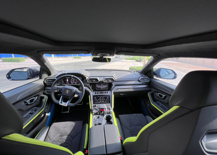 The interior features of the Urus mark it among the top luxury car rentals in Dubai. Its cockpit style, premium Alcantara and leather upholstery accented with the yellow contrast, ample leg and headroom, and cutting-edge technology are remarkable.